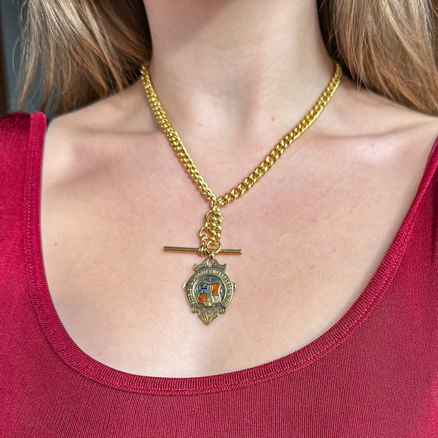 A large shield medallion is also suspended from the end of the chain and is hallmarked Birmingham, 1911. The crest is highlighted in a red and blue enamel and features “Sedgley & District Cricket League 1911” written across the top and the initials W.D. on the reverse.