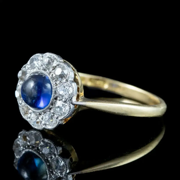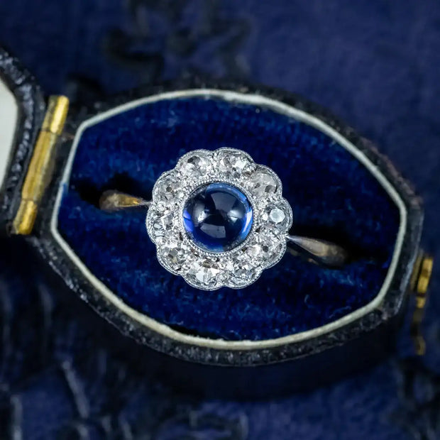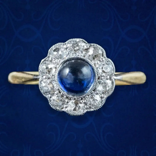 A pretty antique Victorian sapphire daisy cluster ring, crowned with a deep-blue cabochon sapphire in the centre (approx. 0.50ct), haloed by ten twinkling old mine cut diamond petals (approx. 0.40ct total). The stones are set in a scalloped platinum gallery, with pierced sides and milgrain edging, and joins an 18ct yellow gold band at the back.