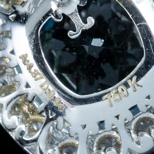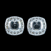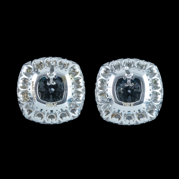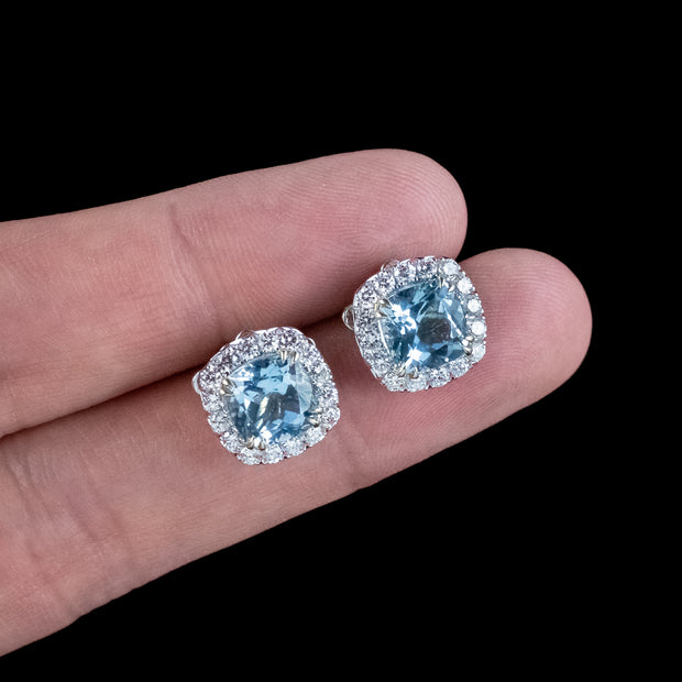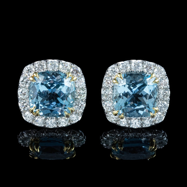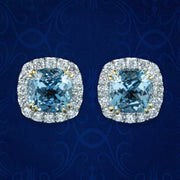 Evoking the serenity of a glittering blue ocean, these dainty Edwardian-inspired aquamarine diamond stud earrings are sure to become a favourite in your jewellery collection. The natural cushion cut aquamarines weigh approx. 2.18ct each (4.37ct total) and are skilfully cut with many glistening facets that capture the light, along with a frame of sixteen brilliant cut diamonds that surround them. They’re extremely bright, with superb SI1 clarity – H colour and have a combined total of 0.94 carats.