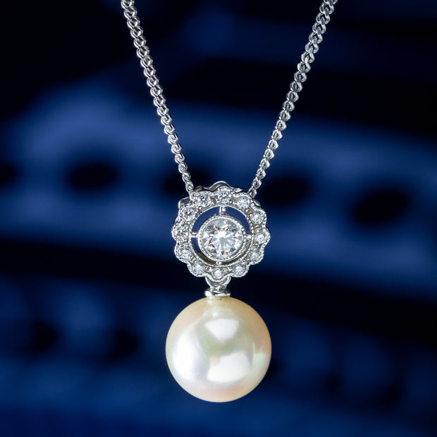 Edwardian Style Pearl Diamond Pendant Necklace 18ct Gold