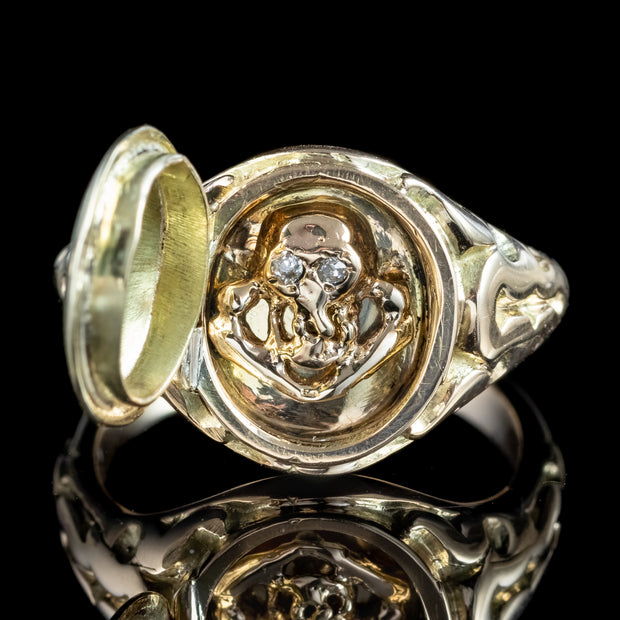This ingenious Georgian-inspired Memento Mori locket ring conceals a spooky surprise within. On its surface, a grand but unassuming signet ring, but its polished, domed front is in fact a secret locket hatch that opens to reveal a small skull and crossbones underneath, dotted with twinkling diamond eyes.