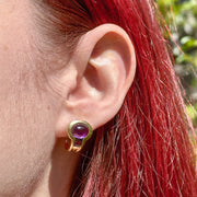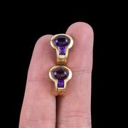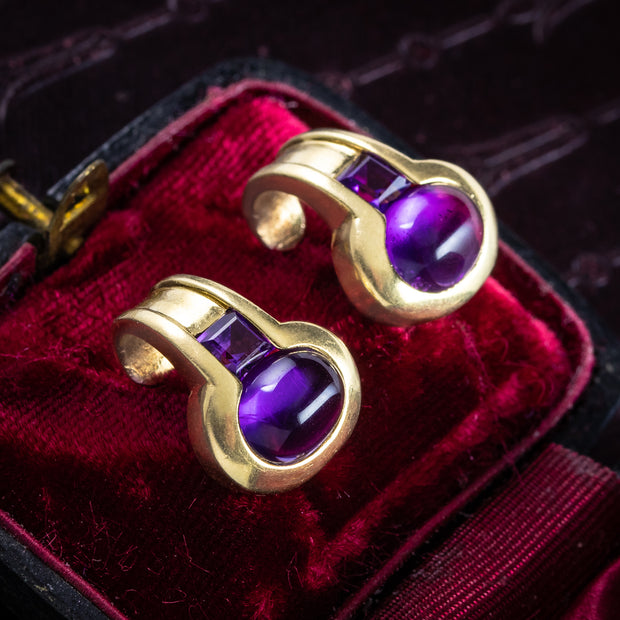 These fabulous vintage amethyst stud earrings combine timeless elegance with modernist flair. Each earring is tension set with a polished cabochon amethyst and a smaller square cut amethyst, exhibiting luxurious deep-purple hues that contrast beautifully against a curvaceous 18ct yellow gold frame, with a sleek hook embellishment at the end that curls under the earlobe when worn. The pair have developed a lovely smoothness and patina over time and are held by butterfly studs at the back.