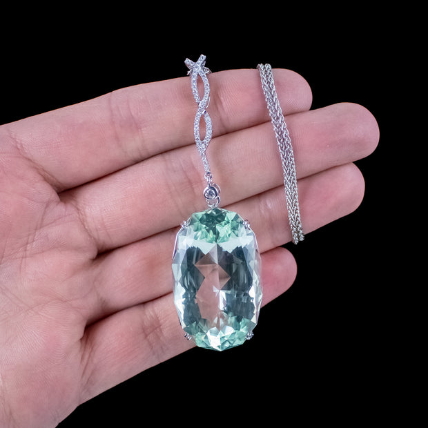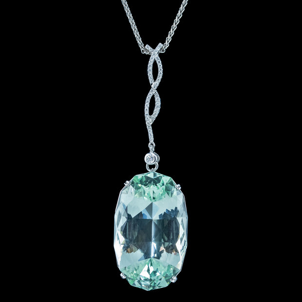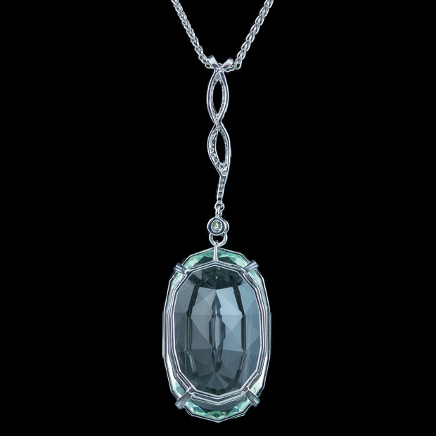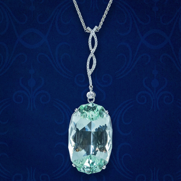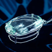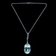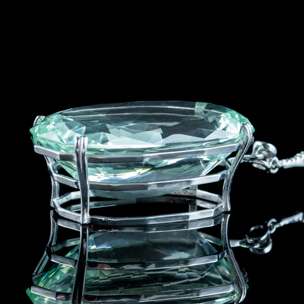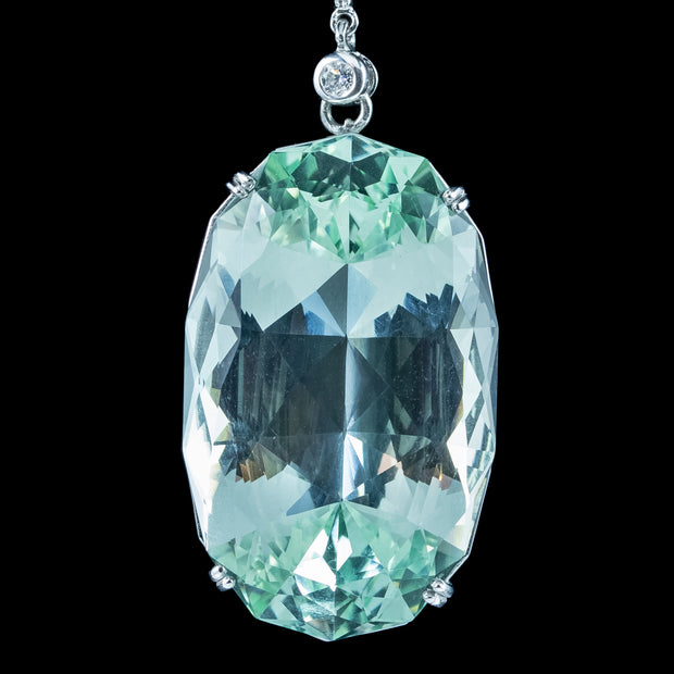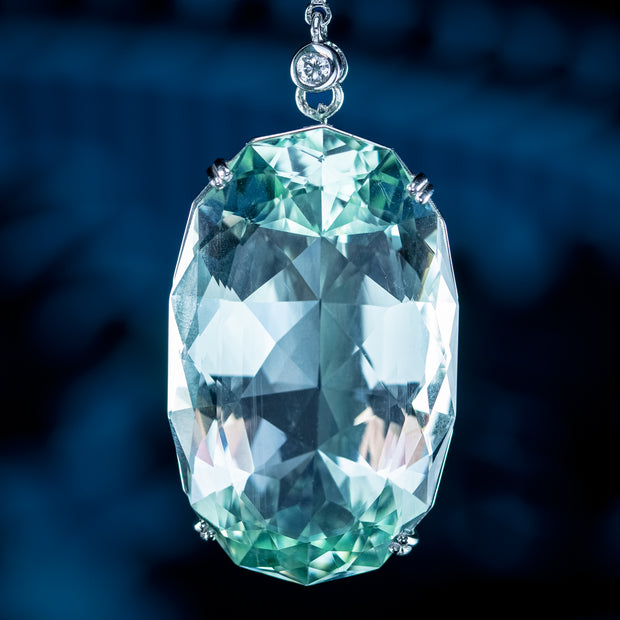 This outstanding vintage aquamarine pendant necklace is bestowed with an enormous oval aquamarine pendant, weighing an impressive 62 carats (approx.) The aqua has a particularly striking glacier-green hue, with expertly cut facets around the back and sides that flicker beautifully, like light rippling on a clear green pool.