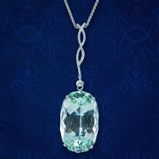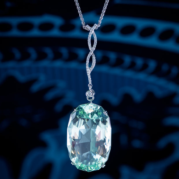 The large aqua is set in an 18ct white gold four-prong gallery, with open sides and is suspended from a long, entwined dropper, lined with twinkling diamonds, leading to a larger brilliant cut diamond in a bezel setting underneath (approx. 0.30ct total).