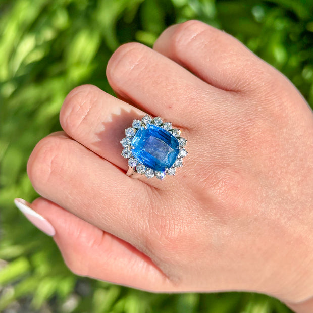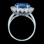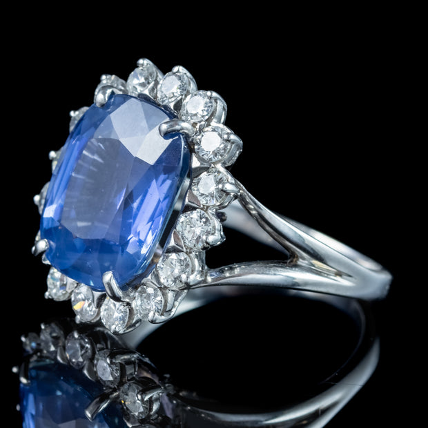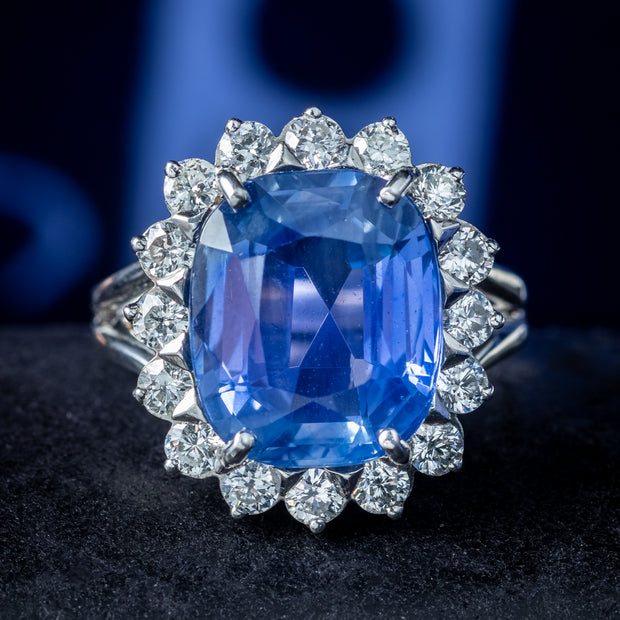Bestowed with a magnificent cornflower blue sapphire, framed by sixteen sparkling brilliant cut diamonds, this remarkable vintage cluster ring is a captivating statement piece like no other. The alluring cushion cut sapphire has been weighed at an impressive 11.32 carats, with approx. 1.35 carats of diamond, boasting excellent SI/ VS clarity – G/I colour. This is all detailed in an accompanying Insurance valuation, issued in 2019 by a trusted NAG registered valuer.
