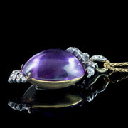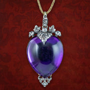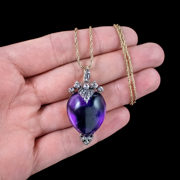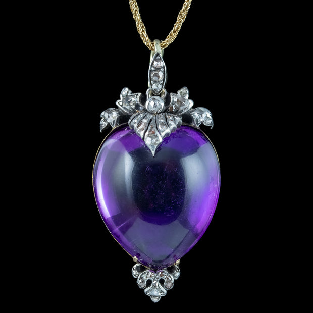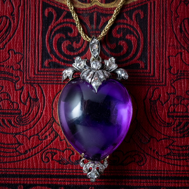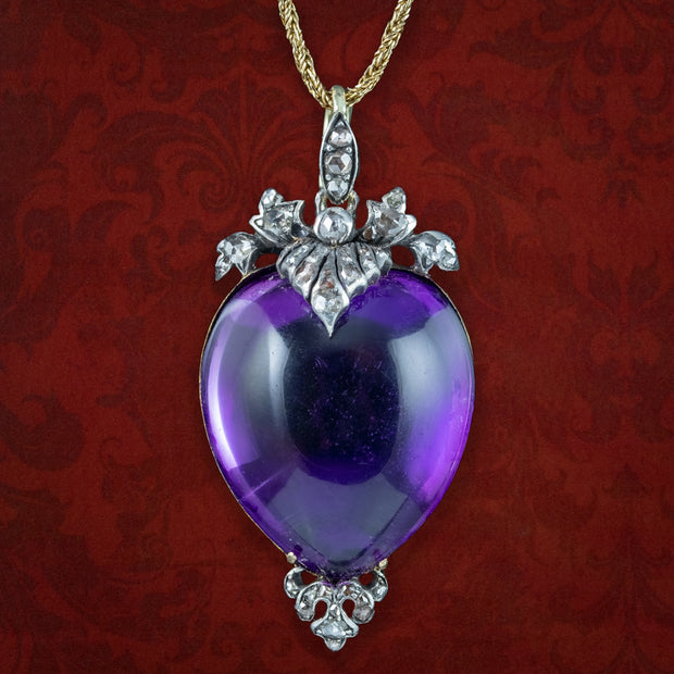 A magnificent antique Georgian amethyst heart pendant, built around an enormous cabochon amethyst heart, with a glossy, gelatinous appearance and deep-purple hue. It weighs approx. 30 carats and is topped with a leafy crown, dotted with twinkling rose cut diamonds that also adorn the loop and a leaf at the bottom (approx. 0.60ct total)