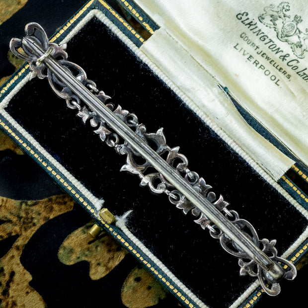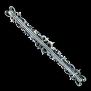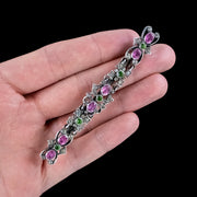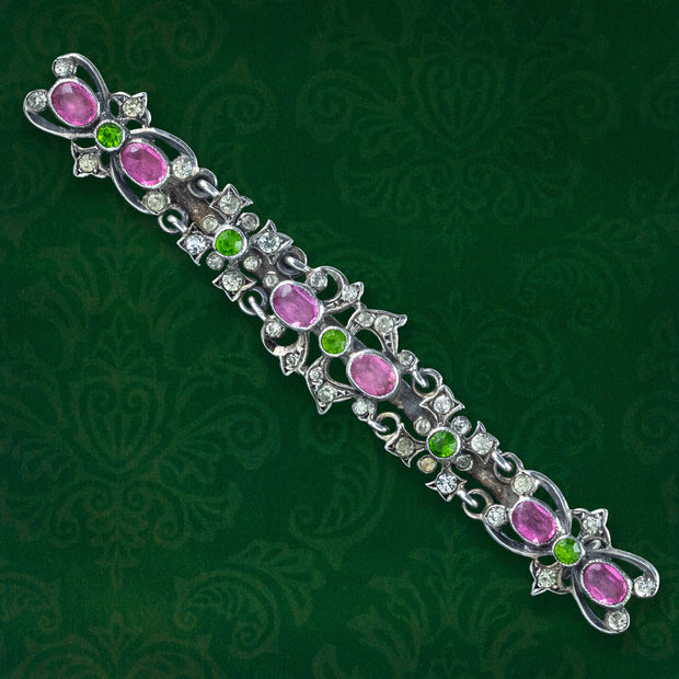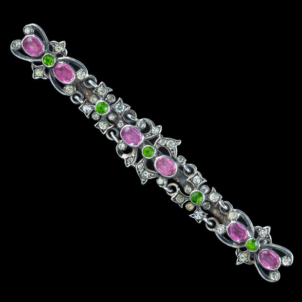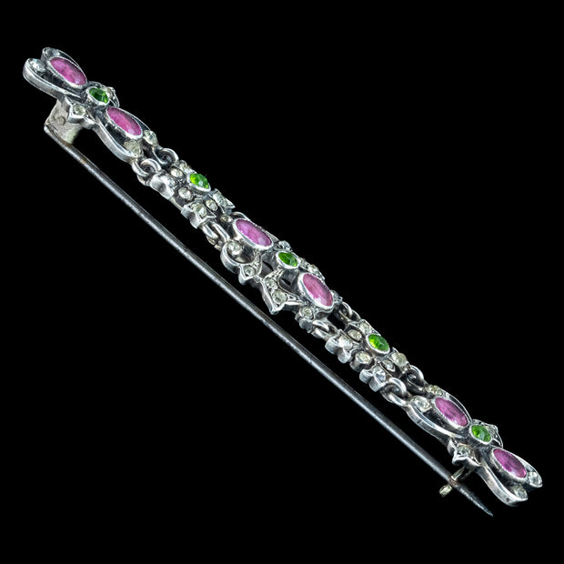 This fabulous, long antique French bar brooch is modelled in silver and features intricate workmanship, consisting of scrolling, foliate motifs decorated with an abundance of bright white, pink and green paste stones.