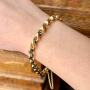 A fabulous antique Victorian bracelet from the late 19th Century, consisting of fancy 15ct yellow gold tulip links, printed with a dotted pattern to give them a lovely texture and sheen.