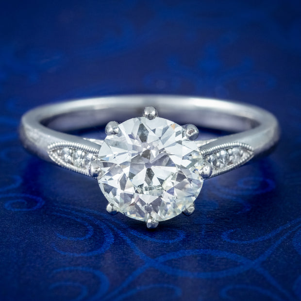 A stunning Edwardian-inspired diamond solitaire ring crowned with the most beautiful old European cut diamond, weighing an impressive 1.78 carats (approx.) The large diamond is bright and full of life and has been certified as natural with excellent SI clarity – K colour. It’s set in a pronounced claw mount that crowns it high atop the finger, all modelled in platinum, with three smaller diamonds chasing down each milgrain shoulder (0.09ct total).