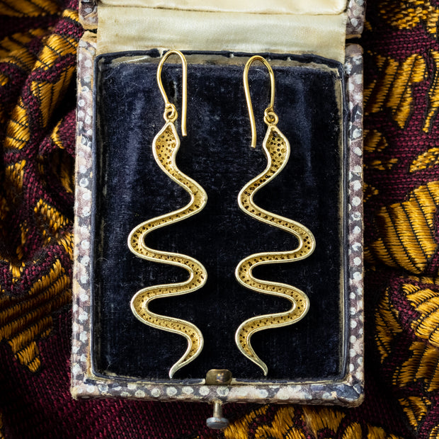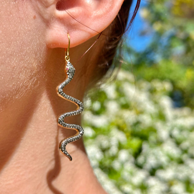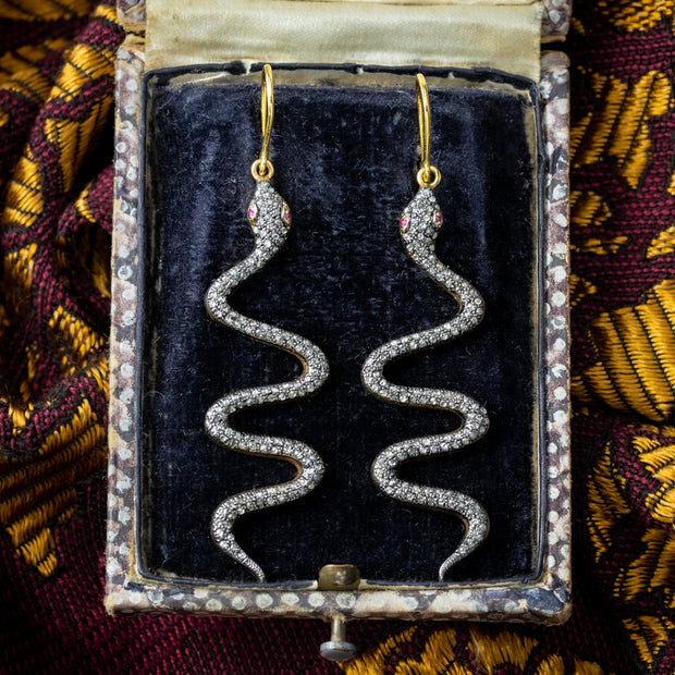 These wonderful Victorian-style diamond drop earrings depict two slithering snakes, encrusted with twinkling rose cut diamonds across the front and ruby eyes at the head.