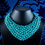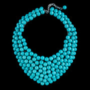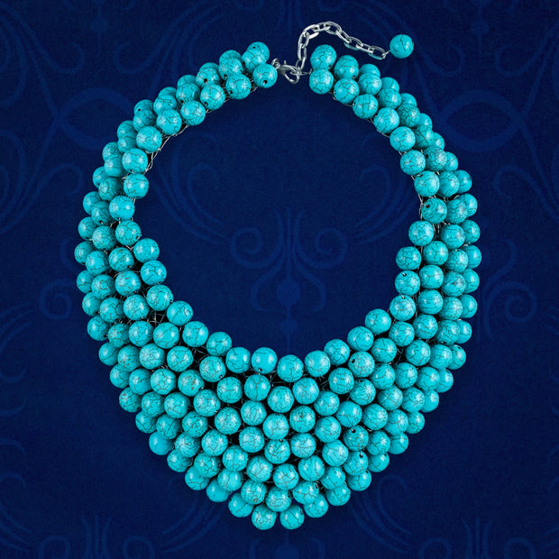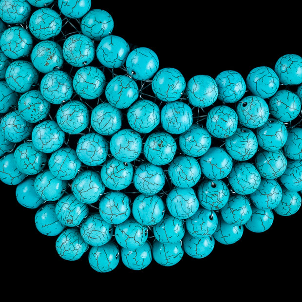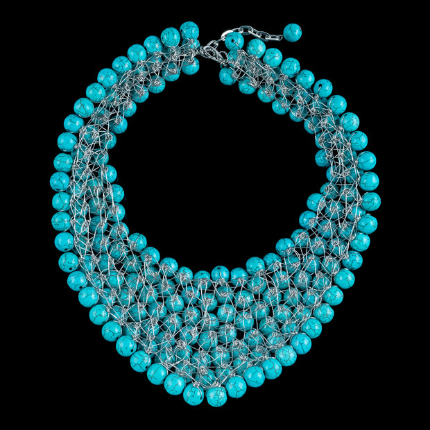 Make a bold statement with this spectacular bib collar necklace, made up of a bountiful collection of polished synthetic turquoise beads that exhibit a calming sky-blue hue and black veins, emulating the stones natural hue and matrix patterning. The beads are intracity woven together, creating a complex web of entangled wires at the back which are strong and flexible, allowing it to articulate and shape comfortably around the neck.