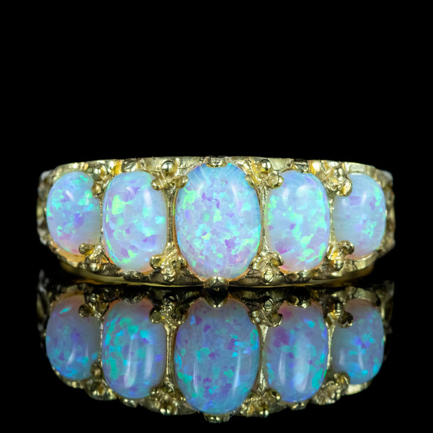 A grand Victorian-inspired opal ring, set with five colourful cultured opal cabochons, glittering with green, blue and purple flecks and haloed by a warm orange glow. The stones graduate in size toward the centre and weigh between 0.25 – 0.80ct each (approx. 2.3ct total).