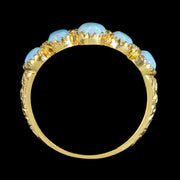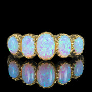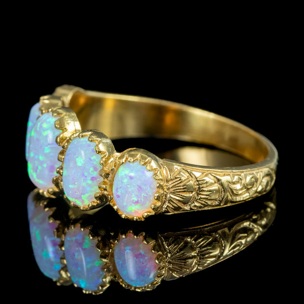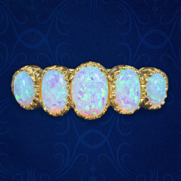 A fabulous Victorian-inspired opal ring, set with five colourful cultured opal cabochons, glittering with green, blue and purple flecks and haloed by a warm orange glow. The stones graduate in size toward the centre and weigh between 0.25 – 0.80ct each (approx. 2.3ct total).