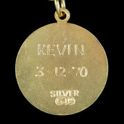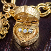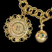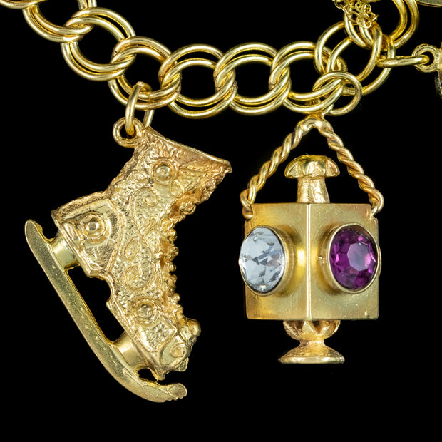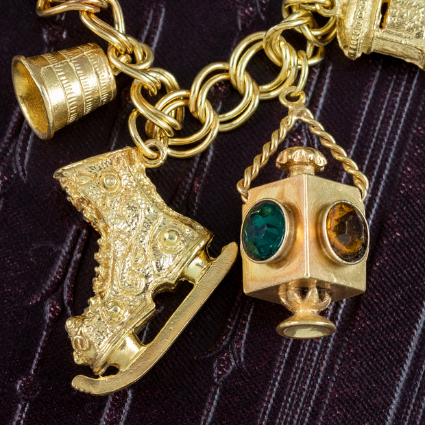 The charms include a small key, a heart ring box with a paste trilogy ring inside, a thimble, a lantern box with four multi-coloured pastes around the outside, an ornate ice skate, a post box, a three pence coin in an ornate frame (Dated 1940), a royal orb studded with coloured pastes and a St. Christopher coin with the inscription “Kevin – 3.12.70” on the back.