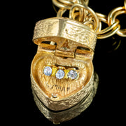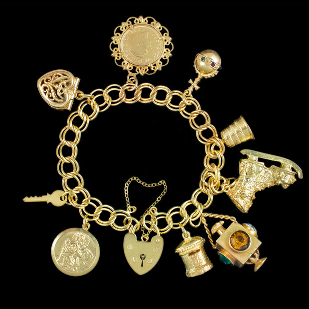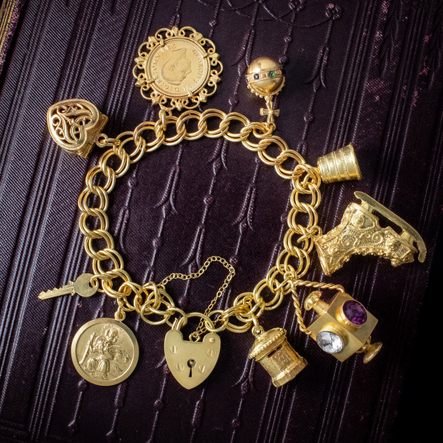 This is a fantastic vintage bracelet with a delightful collection of charms, all held by a safety chain and a heart padlock clasp, complete with London hallmarks on the back, dating to 1978.