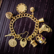 This wonderful vintage charm bracelet is adorned with nine unique charms, suspended from a fancy, double curb link bracelet. It’s all fashioned in silver and has been gilded in a bright 18ct yellow gold.